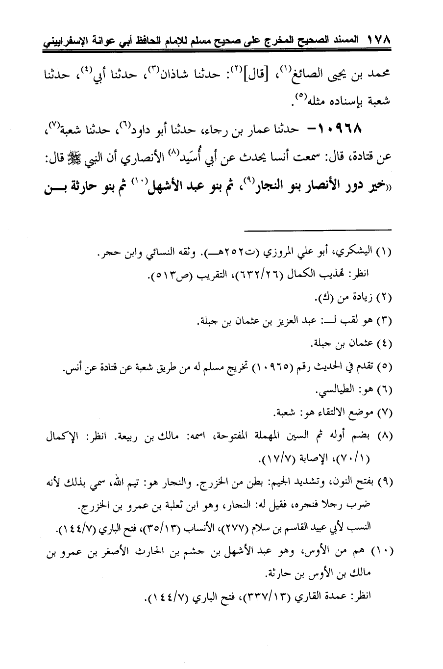 10968 - حدثنا عمار بن رجاء، حدثنا أبو داود (¬1)، حدثنا شعبة (¬2)، عن قتادة، قال: سمعت أنسًا يحدث عن أبي أُسَيد (¬3) الأنصاري أن النبي -صلى الله عليه وسلم- قال: "خير دور الأنصار بنو النجار (¬4)، ثمَّ بنو عبد الأشهل (¬5) ثمَّ بنو حارثة بن