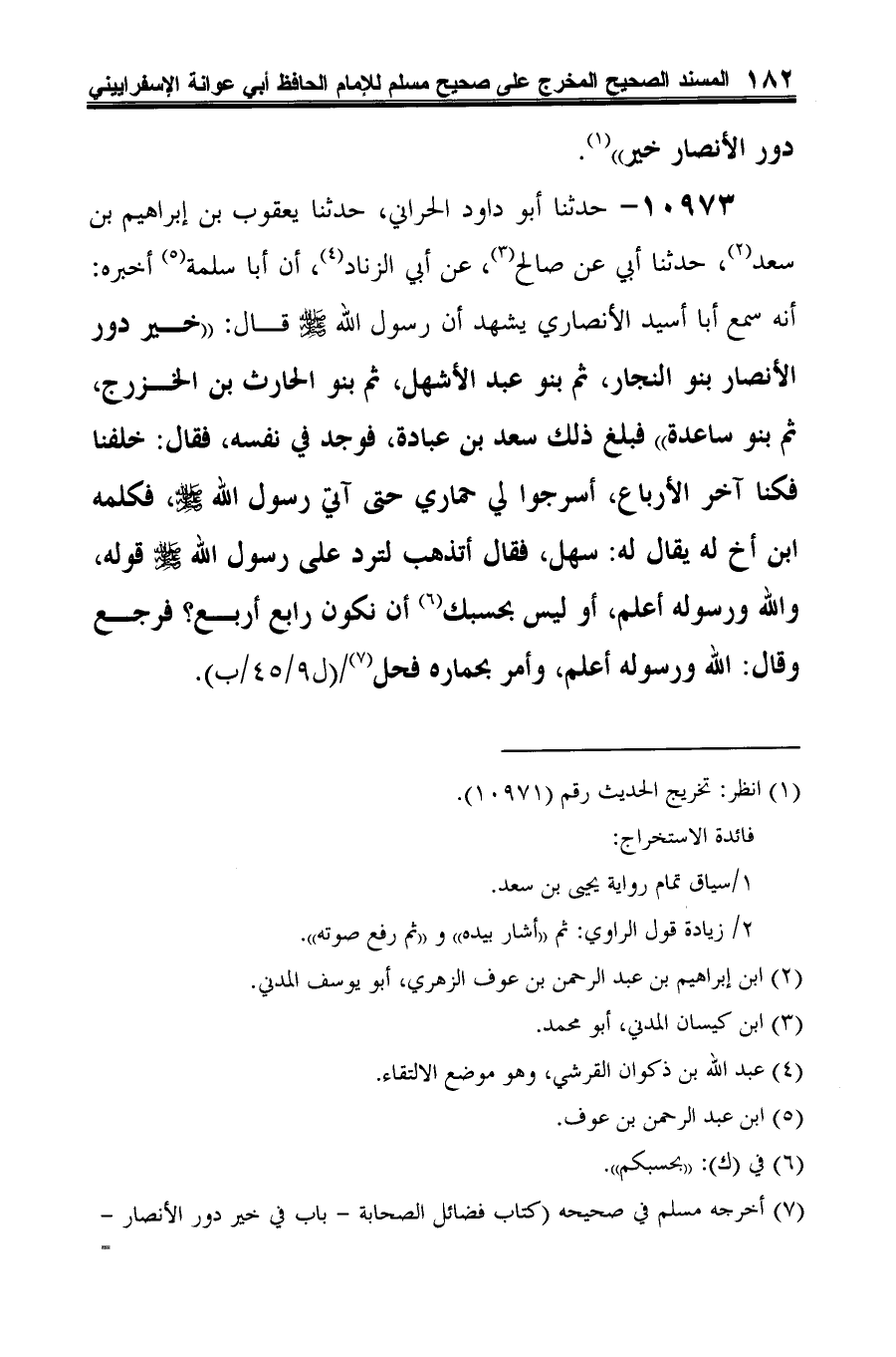 10973 - حدثنا أبو داود الحراني، حدثنا يعقوب بن إبراهيم بن سعد (¬1)، حدثنا أبي عن صالح (¬2)، عن أبي الزناد (¬3)، أن أبا سلمة (¬4) أخبره: أنَّه سمع أبا أسيد الأنصاري يشهد أن رسول الله -صلى الله عليه وسلم- قال: "خير دور الأنصار بنو النجار، ثمَّ بنو عبد الأشهل، ثمَّ بنو الحارث بن الخزرج، ثمَّ بنو ساعدة" فبلغ ذلك سعد بن عبادة، فوجد في نفسه، فقال: خلفنا فكنا آخر الأرباع، أسرجوا لي حماري حتى آتي رسول الله -صلى الله عليه وسلم-، فكلمه ابن أخ له يقال له: سهل، فقال أتذهب لترد على رسول الله -صلى الله عليه وسلم- قوله، والله ورسوله أعلم، أو ليس بحسبك (¬5) أن نكون رابع أربع؟ فرجع وقال: الله ورسوله أعلم، وأمر بحماره فحل (¬6).