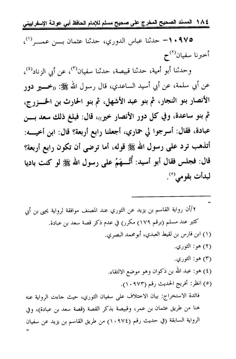 وحدثنا أبو أمية، حدثنا قبيصة، حدثنا سفيان (¬3)، عن أبي الزناد (¬4)، عن أبي سلمة، عن أبي أسيد الساعدي، قال رسول الله -صلى الله عليه وسلم-: "خير دور الأنصار بنو النجار ثم بنو عبد الأشهل، ثمّ بنو الحارث بن الخزرج، ثمَّ بنو ساعدة، وفي كل دور الأنصار خير"، قال: فبلغ ذلك سعد بن عبادة، فقال: أسرجوا لي حماري، أجعلنا رابع أربعة؟ قال: ابن أخيه: أتذهب ترد على رسول الله -صلى الله عليه وسلم- قوله، أما ترضى أن تكون رابع أربعة؟ قال: فجلس فقال أبو أسيد: أُتَّهَمُ على رسول الله -صلى الله عليه وسلم- لو كنت باديا لبدأت بقومي (¬5).