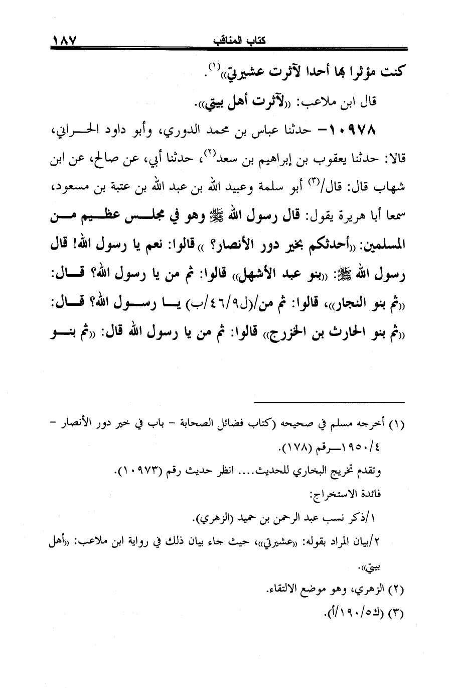 10978 - حدثنا عباس بن محمَّد الدوري، وأبو داود الحراني، قالا: حدثنا يعقوب بن إبراهيم بن سعد (¬1)، حدثنا أبي، عن صالح، عن ابن شهاب قال: قال (¬2) أبو سلمة وعبيد الله بن عبد الله بن عتبة بن مسعود، سمعا أبا هريرة يقول: قال رسول الله -صلى الله عليه وسلم- وهو في مجلس عظيم من المسلمين: "أحدثكم بخير دور الأنصار؟ " قالوا: نعم يا رسول الله" قال رسول الله -صلى الله عليه وسلم-: "بنو عبد الأشهل" قالوا: ثمَّ من يا رسول الله؟ قال: "ثمَّ بنو النجار"، قالوا: ثمَّ من يا رسول الله؟ قال: "ثمَّ بنو الحارث بن الخزرج" قالوا: ثمَّ من يا رسول الله قال: "ثمَّ بنو