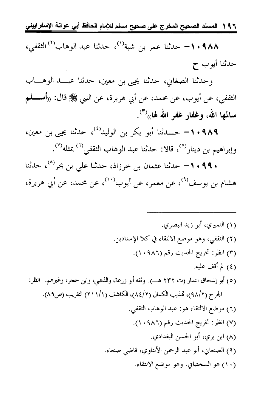 وحدثنا الصغاني، حدثنا يحيى بن معين، حدثنا عبد الوهاب الثقفي، عن أيوب، عن محمَّد، عن أبي هريرة، عن النبي -صلى الله عليه وسلم- قال: "أسلم سالمها الله، وغفار غفر الله لها" (¬3).