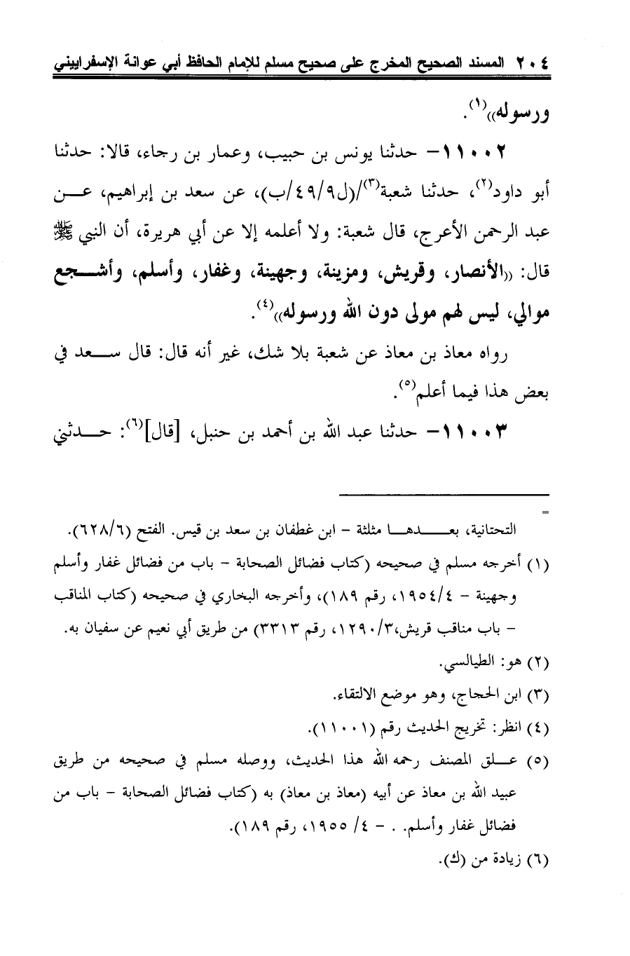 11002 - حدثنا يونس بن حبيب، وعمار بن رجاء، قالا: حدثنا أبو داود (¬1)، حدثنا شعبة (¬2)، عن سعد بن إبراهيم، عن عبد الرحمن الأعرج، قال شعبة: ولا أعلمه إلا عن أبي هريرة، أن النبي -صلى الله عليه وسلم- قال: "الأنصار، وقريش، ومزينة، وجهينة، وغفار، وأسلم، وأشجع موالي، ليس لهم مولى دون الله ورسوله" (¬3).