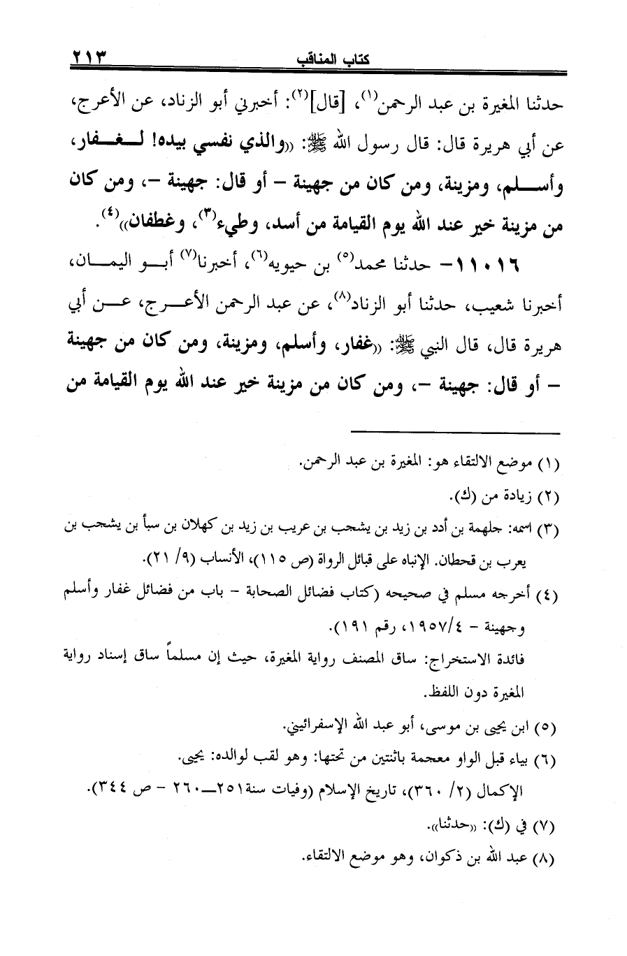 11016 - حدثنا محمَّد (¬1) بن حيويه (¬2)، أخبرنا (¬3) أبو اليمان، أخبرنا شعيب، حدثنا أبو الزناد (¬4)، عن عبد الرحمن الأعرج، عن أبي هريرة قال، قال النبي -صلى الله عليه وسلم-: "غفار، وأسلم، ومزينة، ومن كان من جهينة -أو قال: جهينة-، ومن كان من مزينة خير عند الله يوم القيامة من