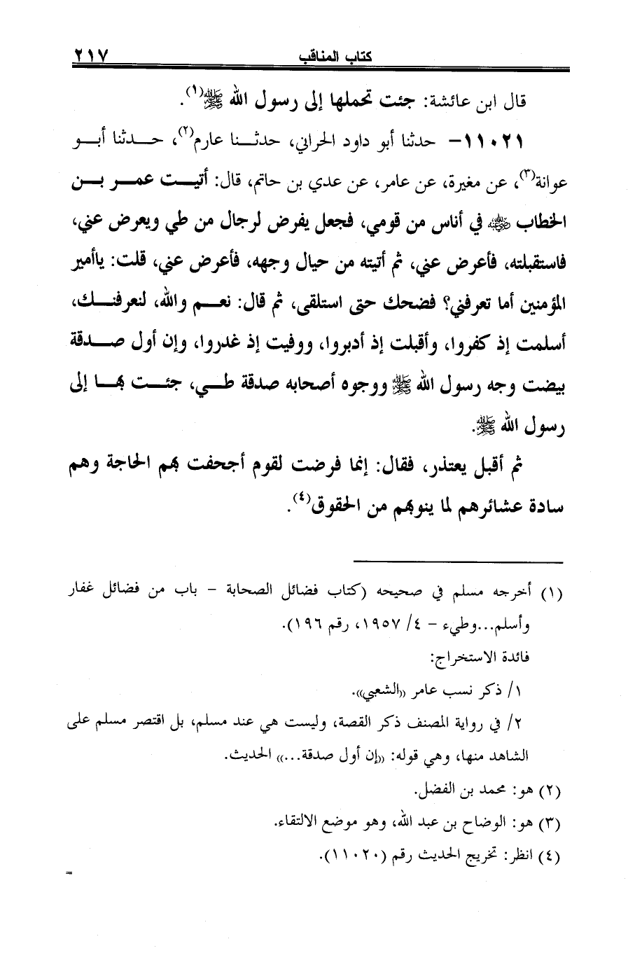 11021 - حدثنا أبو داود الحراني، حدثنا عارم (¬1)، حدثنا أبو عوانة (¬2)، عن مغيرة، عن عامر، عن عديّ بن حاتم، قال: أتيت عمر بن الخطاب -رضي الله عنه- في أناس من قومي، فجعل يفرض لرجال من طي ويعرض عني، فاسقبلته، فأعرض عني، ثمَّ أتيته من حيال وجهه، فأعرض عني، قلت: يا أمير المؤمنين أما تعرفني؛ فضحك حتى استلقى، ثمَّ قال: نعم والله، لنعرفنك، أسلمت إذ كفروا، وأقبلت إذ أدبروا، ووفيت إذ غدروا، وإن أول صدقة بيضت وجه رسول الله -صلى الله عليه وسلم- ووجوه أصحابه صدقة طي، جئت بها إلى رسول الله -صلى الله عليه وسلم-.