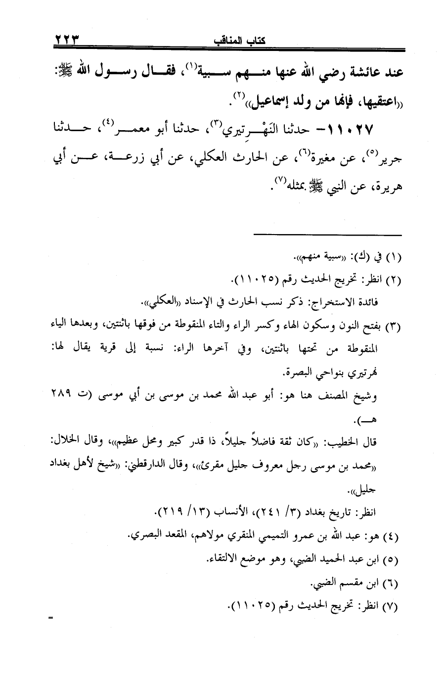 11027 - حدثنا النَهْرِتيري (¬1)، حدثنا أبو معمر (¬2)، حدثنا جرير (¬3)، عن مغيرة (¬4)، عن الحارث العكلي، عن أبي زرعة، عن أبي هريرة، عن النبي -صلى الله عليه وسلم- بمثله (¬5).