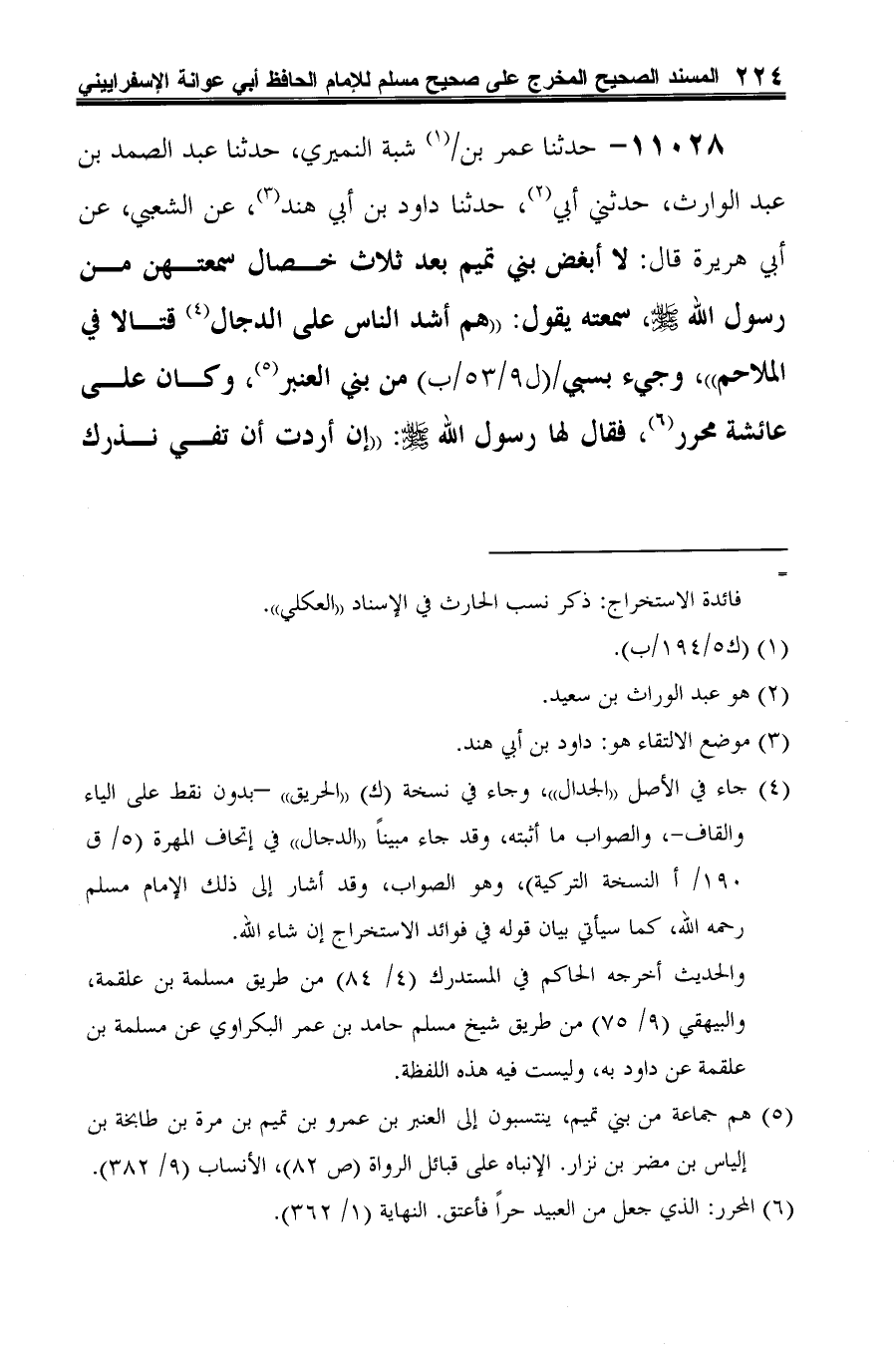 11028 - حدثنا عمر بن (¬1) شبة النميري، حدثنا عبد الصمد بن عبد الوارث، حدثني أبي (¬2)، حدثنا داود بن أبي هند (¬3)، عن الشعبي، عن أبي هريرة قال: لا أبغض بني تميم بعد ثلاث خصال سمعتهن من رسول الله -صلى الله عليه وسلم-، سمعته يقول: "هم أشد الناس على الدجال (¬4) قتالا في الملاحم"، وجيء بسبي من بني العنبر (¬5)، وكان على عائشة محرر (¬6)، فقال لها رسول الله -صلى الله عليه وسلم-: "إن أردت أن تفي نذرك