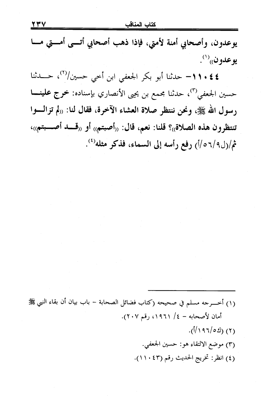 11044 - حدثنا أبو بكر الجعفي ابن أخي حسين (¬1)، حدثنا حسين الجعفي (¬2)، حدثنا مجمع بن يحيى الأنصاري بإسناده: خرج علينا رسول الله -صلى الله عليه وسلم-، ونحن ننتظر صلاة العشاء الآخرة، فقال لنا: "لم تزالوا تنتظرون هذه الصلاة"؟ قلنا: نعم، قال: "أصبتم" أو "قد أصبتم"، ثمَّ رفع رأسه إلى السماء، فذكر مثله (¬3).