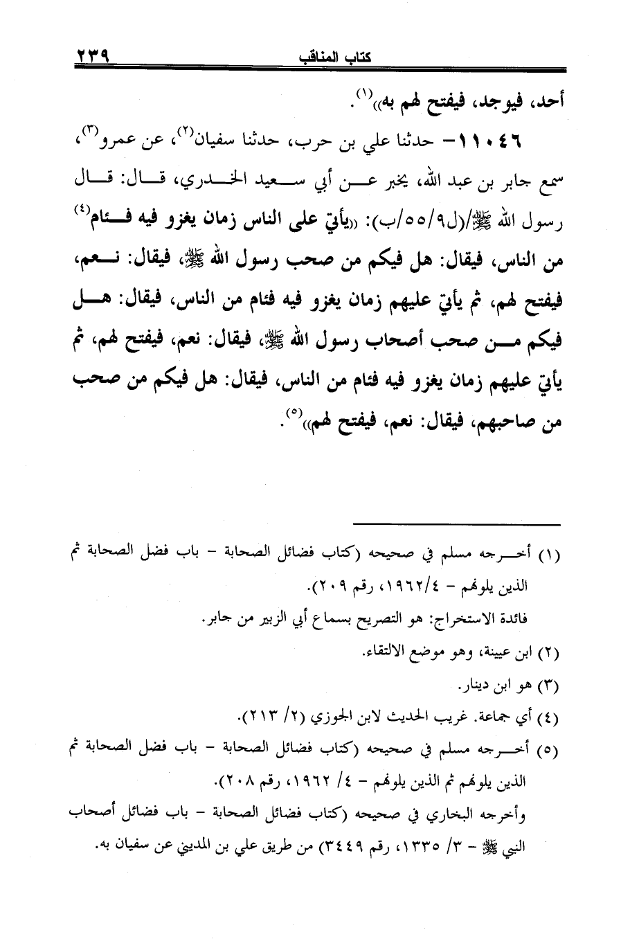 11046 - حدثنا علي بن حرب، حدثنا سفيان (¬1)، عن عمرو (¬2)، سمع جابر بن عبد الله، يخبر عن أبي سعيد الخدري، قال: قال رسول الله -صلى الله عليه وسلم-: "يأتي على الناس زمان يغزو فيه فئام (¬3) من الناس، فيقال: هل فيكم من صحب رسول الله -صلى الله عليه وسلم-، فيقال: نعم، فيفتح لهم، ثمَّ يأتي عليهم زمان يغزو فيه فئام من الناس، فيقال: هل فيكم من صحب أصحاب رسول الله -صلى الله عليه وسلم-، فيقال: نعم، فيفتح لهم، ثمَّ يأتي عليهم زمان يغزو فيه فئام من الناس، فيقال: هل فيكم من صحب من صاحبهم، فيقال: نعم، فيفتح لهم" (¬4).