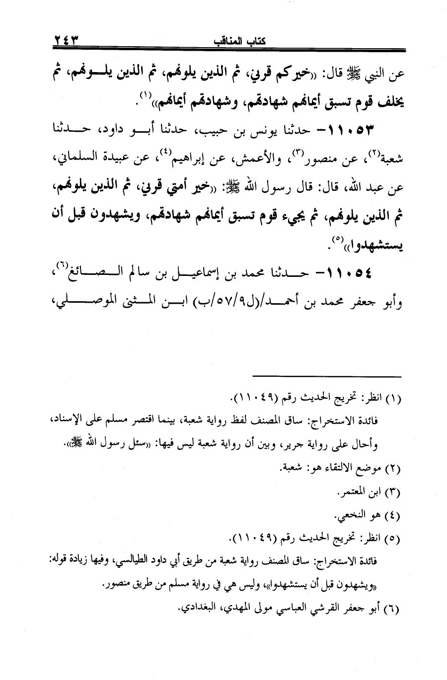 -[244]- والصغاني، قالوا: حدثنا يحيى بن أبي بكير (¬2)، حدثنا شعبة (¬3)، عن سليمان (¬4)، ومنصور، عن إبراهيم، عن عبيدة، عن عبد الله، أن رسول الله -صلى الله عليه وسلم- قال: "خيركم قرني، ثمَّ الذين يلونهم، ثمَّ الذين يلونهم، ثمَّ ينبغ (¬5) قوم (¬6) تبدر أيمانهم شهادتهم، وشهادتهم أيمانهم" (¬7).