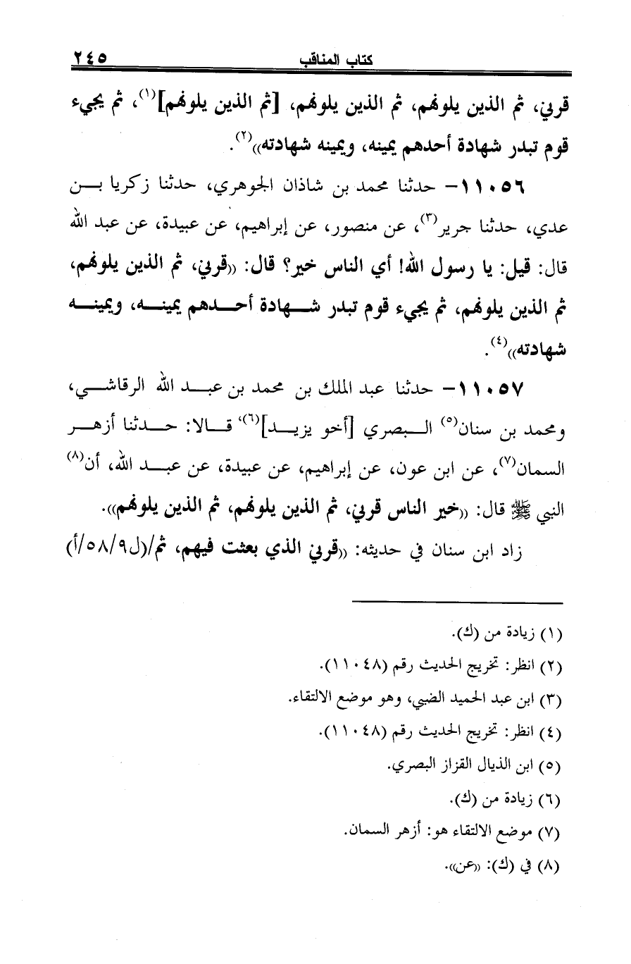 11056 - حدثنا محمَّد بن شاذان الجوهري، حدثنا زكريا بن عليّ، حدثنا جرير (¬1)، عن منصور، عن إبراهيم، عن عبيدة، عن عبد الله قال: قيل: يا رسول الله! أي الناس خير؛ قال: "قرني، ثمَّ الذين يلونهم، ثمَّ الذين يلونهم، ثمَّ يجيء قوم تبدر شهادة أحدهم يمينه، ويمينه شهادته" (¬2).