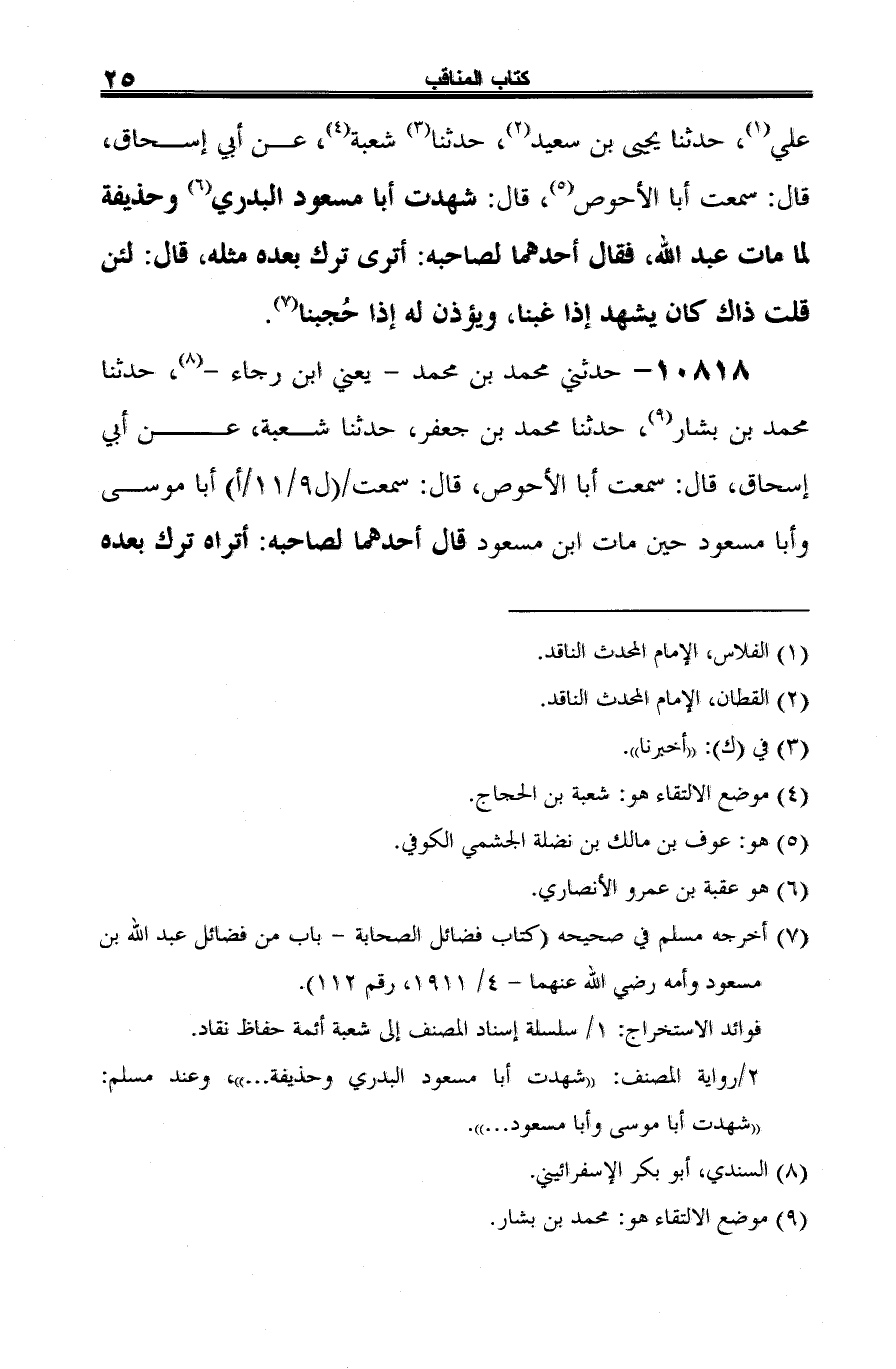 10818 - حدثني محمد بن محمد -يعني ابن رجاء- (¬1)، حدثنا محمد بن بشار (¬2)، حدثنا محمد بن جعفر، حدثنا شعبة، عن أبي إسحاق، قال: سمعت أبا الأحوص، قال: سمعت أبا موسى وأبا مسعود حين مات ابن مسعود قال أحدهما لصاحبه: أتراه ترك بعده