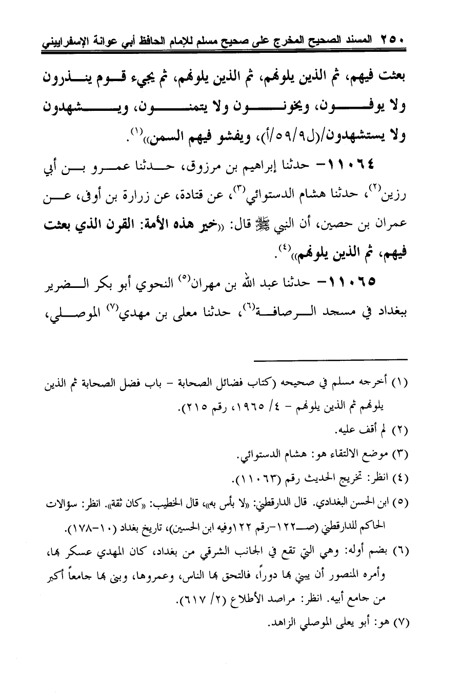 11064 - حدثنا إبراهيم بن مرزوق، حدثنا عمرو بن أبي رزين (¬1)، حدثنا هشام الدستوائي (¬2)، عن قتادة، عن زرارة بن أوفى، عن عمران بن حصين، أن النبي -صلى الله عليه وسلم- قال: "خير هذه الأمة: القرن الذي بعثت فيهم، ثمَّ الذين يلونهم" (¬3).