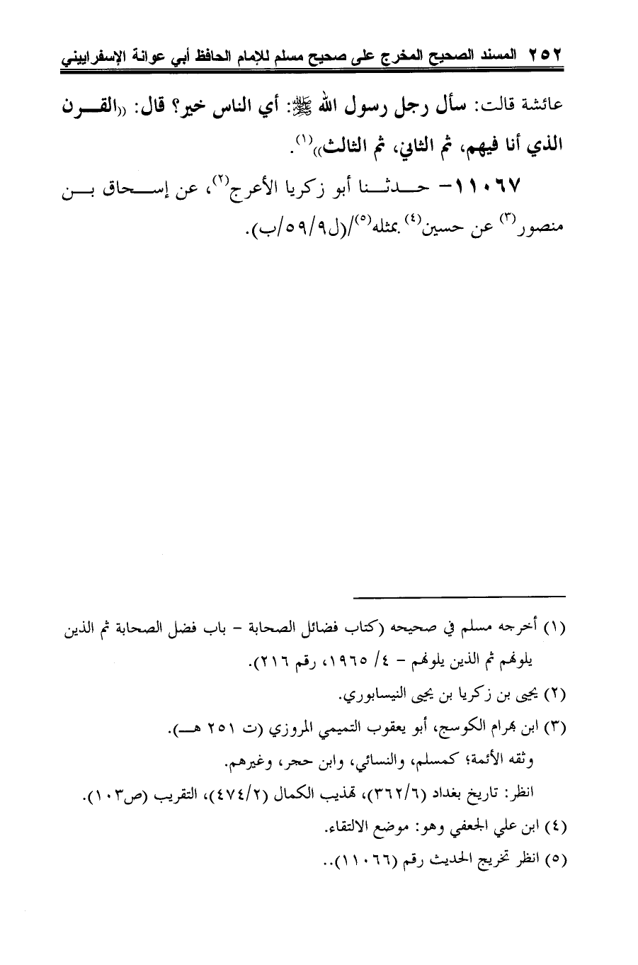 11067 - حدثنا أبو زكريا الأعرج (¬1)، عن إسحاق بن منصور (¬2) عن حسين (¬3) بمثله (¬4).