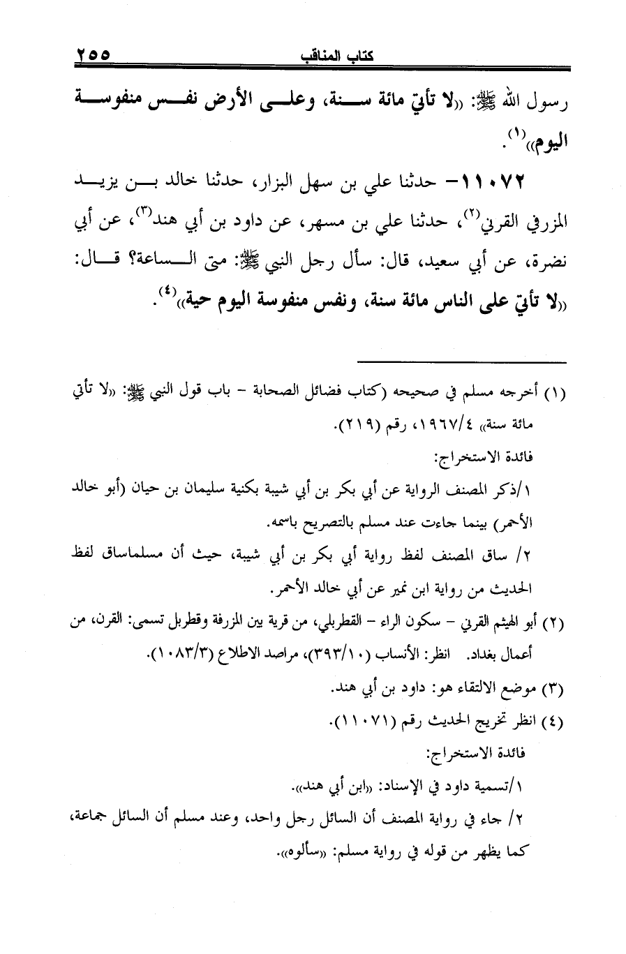 11072 - حدثنا علي بن سهل البزار، حدثنا خالد بن يزيد المزرفي القرني (¬1)، حدثنا علي بن مسهر، عن داود بن أبي هند (¬2)، عن أبي نضرة، عن أبي سعيد، قال: سأل رجل النبي -صلى الله عليه وسلم-: متى الساعة؟ قال: "لا تأتي على الناس مائة سنة، ونفس منفوسة اليوم حية" (¬3).