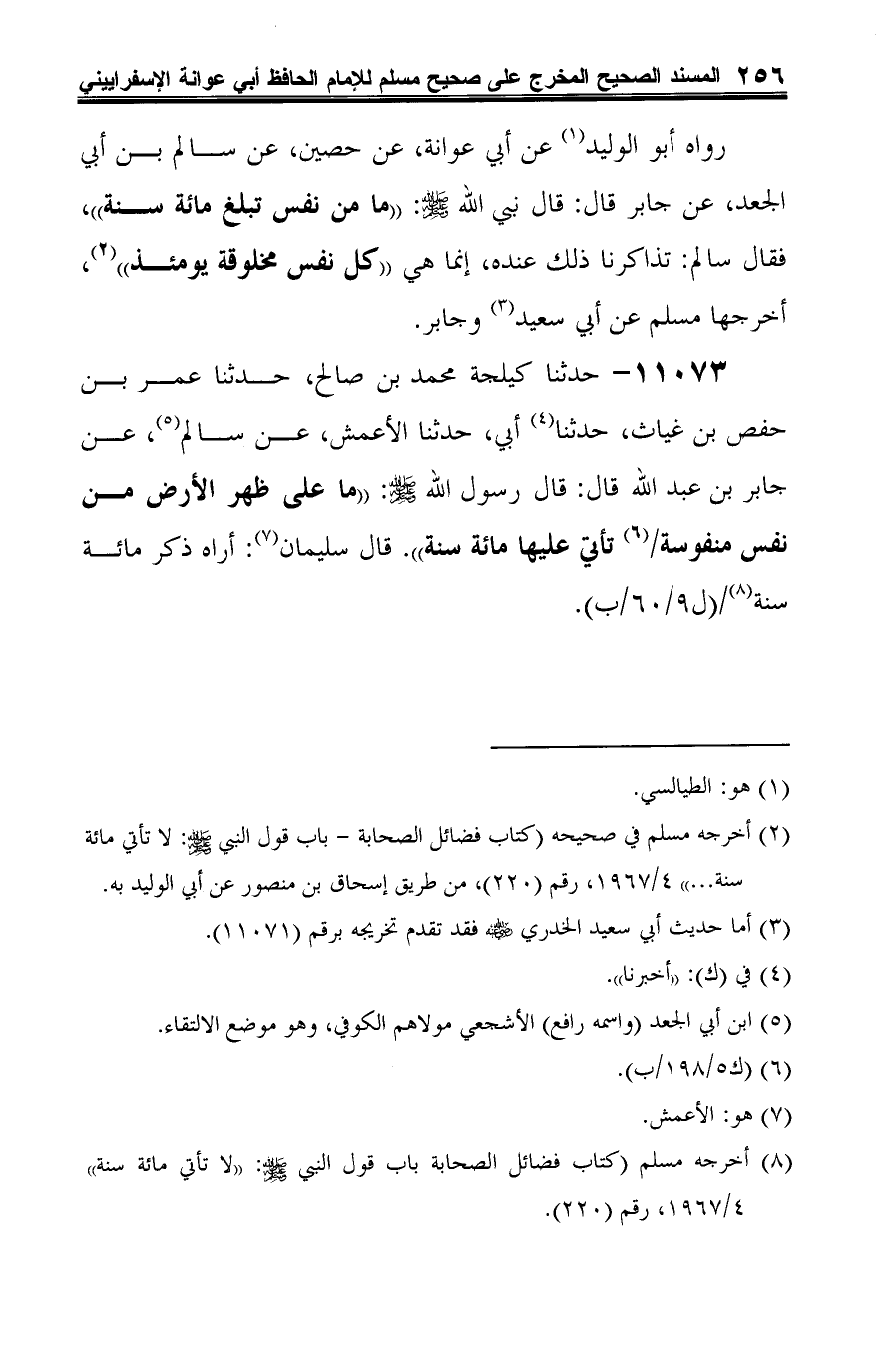 11073 - حدثنا كيلجة محمَّد بن صالح، حدثنا عمر بن حفص بن غياث، حدثنا (¬1) أبي، حدثنا الأعمش، عن سالم (¬2)، عن جابر بن عبد الله قال: قال رسول الله -صلى الله عليه وسلم-: "ما على ظهر الأرض من نفس منفوسة (¬3) تأتي عليها مائة سنة". قال سليمان (¬4): أراه ذكر مائة سنة (¬5).