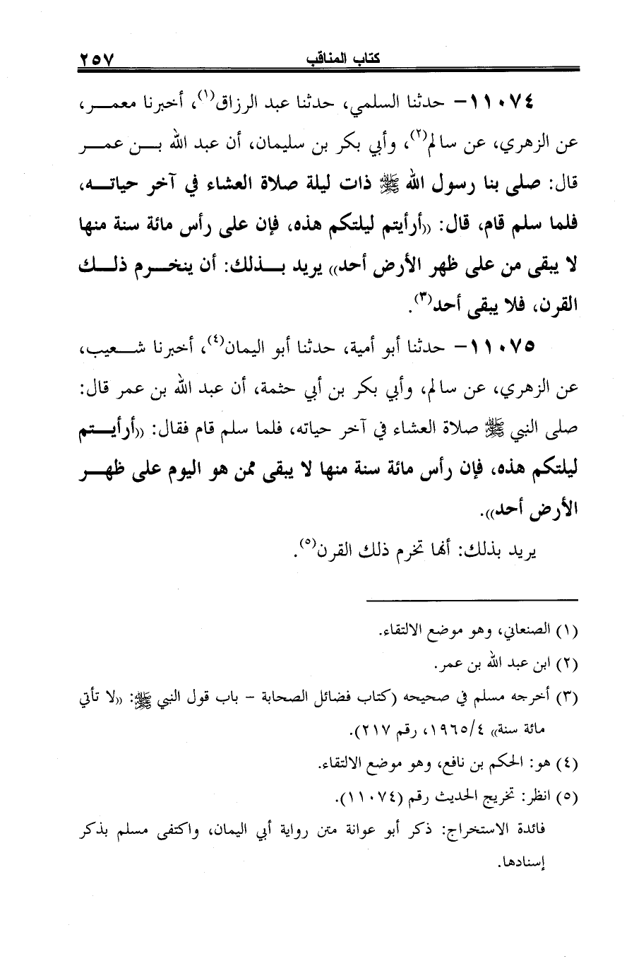 11074 - حدثنا السلمي، حدثنا عبد الرزاق (¬1)، أخبرنا معمر، عن الزهري، عن سالم (¬2)، وأبي بكر بن سليمان، أن عبد الله بن عمر قال: صلى بنا رسول الله -صلى الله عليه وسلم- خمس ذات ليلة صلاة العشاء في آخر حياته، فلما سلم قام، قال: "أرأيتم ليلتكم هذه، وإن على رأس مائة سنة منها لا يبقى من على ظهر الأرض أحد" يريد بذلك: أن ينخرم ذلك القرن، فلا يبقى أحد (¬3).