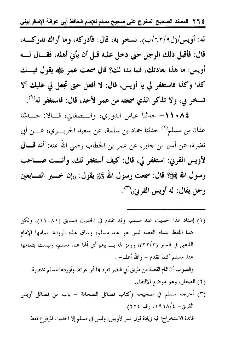 11084 - حدثنا عباس الدوري، والصغاني، قالا: حدثنا عفان بن مسلم (¬1) حدثنا حماد بن سلمة، عن سعيد الجريري، عن أبي نضرة، عن أسير بن جابر، عن عمر بن الخطّاب -رضي الله عنه-: أنه قال لأويس القرني: استغفر لي، قال: كيف أستغفر لك، وأنت صاحب رسول الله -صلى الله عليه وسلم-؟ قال: سمعت رسول الله -صلى الله عليه وسلم- يقول: "إن خير التابعين رجل يقال: له أويس القرني" (¬2).