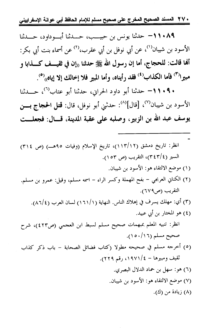 11089 - حدثنا يونس بن حبيب، حدثنا أبو داود، حدثنا الأسود بن شيبان (¬1)، عن أبي نوفل بن أبي عقرب، (¬2) عن أسماء بنت أبي بكر: أنها قالت: للحجاج، أما إن رسول الله -صلى الله عليه وسلم- حدثنا "إن في ثقيف كذابا ومبيرا (¬3) فأما الكذاب (¬4) فقد رأيناه، وأما المبير فلا إخالك إلا إياه" (¬5).
