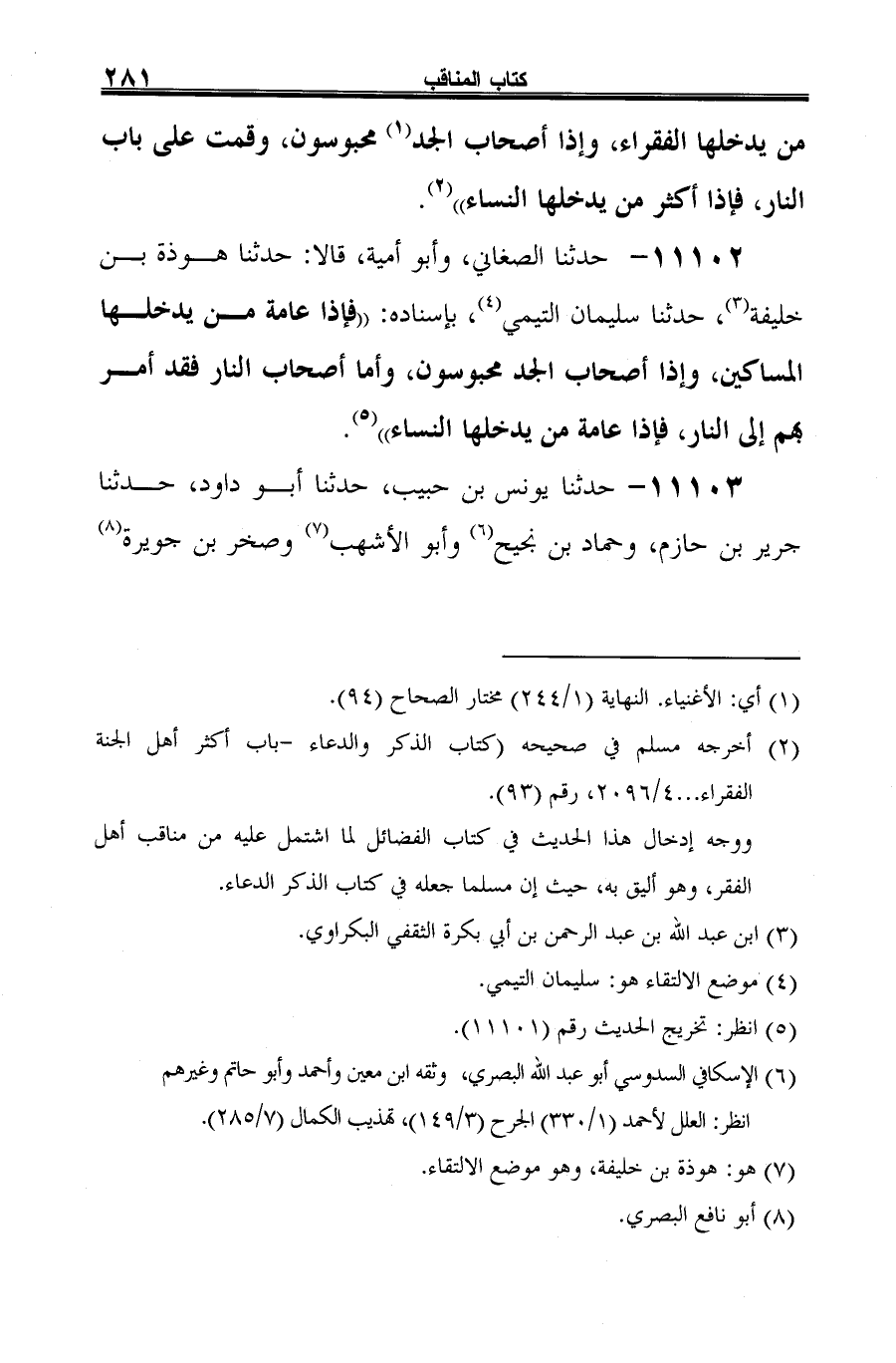 11102 - حدثنا الصغاني، وأبو أمية، قالا: حدثنا هوذة بن خليفة (¬1)، حدثنا سليمان التيمي (¬2)، بإسناده: "فإذا عامة من يدخلها المساكين، وإذا أصحاب الجد محبوسون، وأما أصحاب النار فقد أمر بهم إلى النار، فإذا عامة من يدخلها النساء" (¬3).