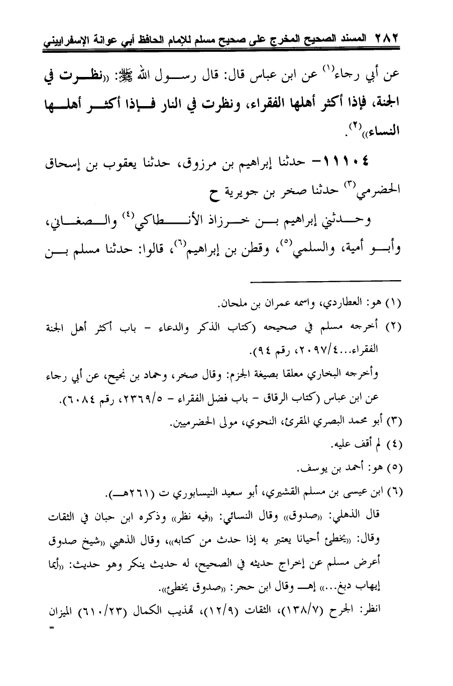 -[283]- إبراهيم (¬5) حدثنا صخر بن جويرية، وحماد بن نجيح، قالا: حدثنا (¬6) أبو رجاء العطاردي، قال: سمعت ابن عباس. يقول: سمعت النبي صلى الله عليه وسلم يقول: "اطلعت في الجنة فرأيت عامة أهلها الفقراء واطلعت في النار فرأيت عامة أهلها النساء" (¬7).