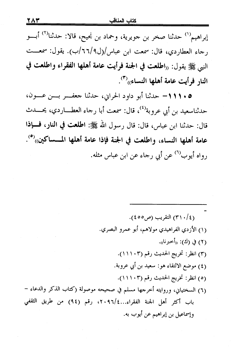 (¬3) السختياني، وروايته أخرجها مسلم في صحيحه موصولة (كتاب الذكر والدعاء - باب أكثر أهل الجنة الفقراء ... 4/ 2096، رقم (94) من طريق الثقفي وإسماعيل بن إبراهيم عن أيوب به.
