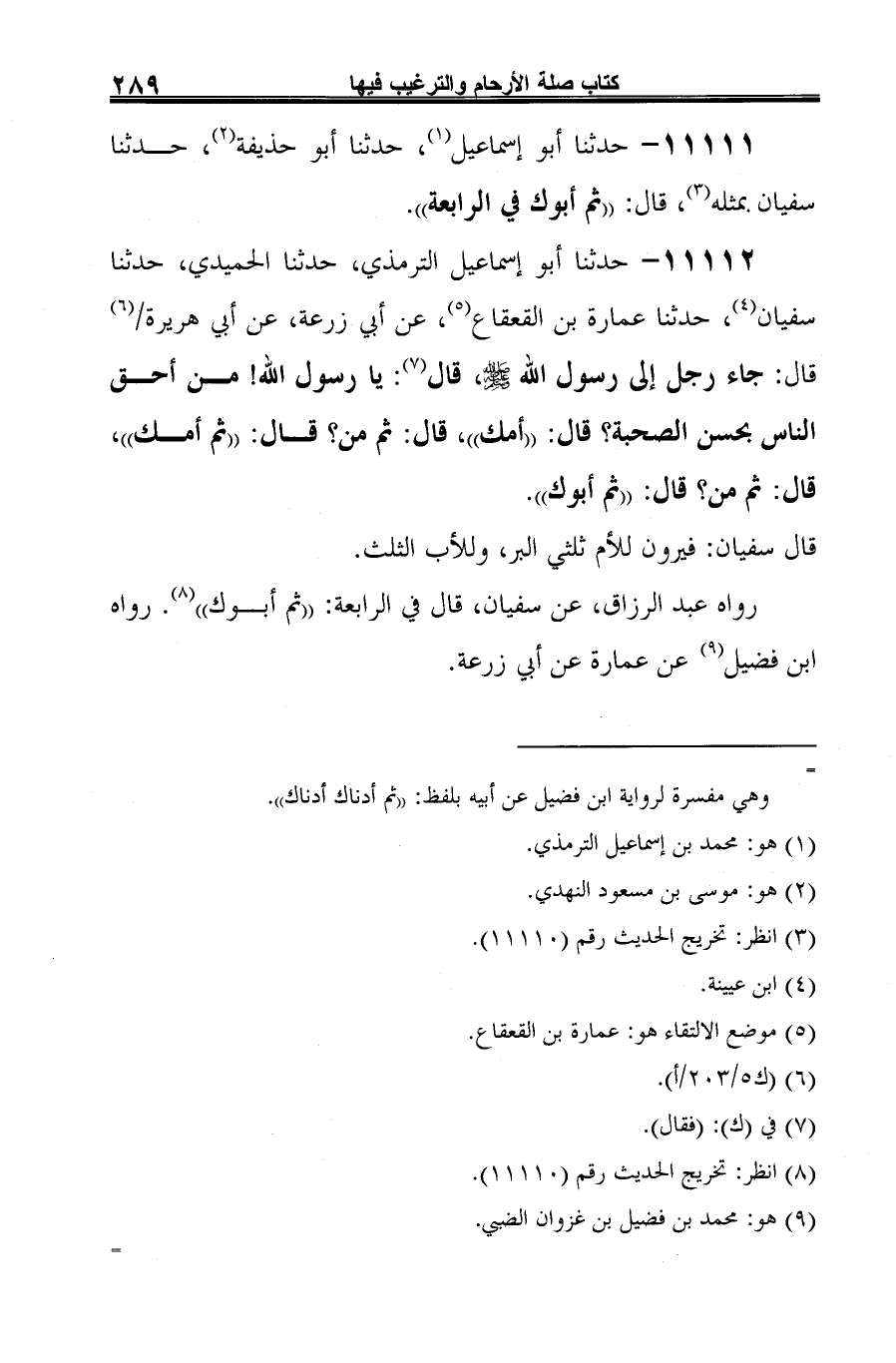 11112 - حدثنا أبو إسماعيل الترمذي، حدثنا الحميدي، حدثنا سفيان (¬1)، حدثنا عمارة بن القعقاع (¬2)، عن أبي زرعة، عن أبي هريرة (¬3) قال: جاء رجل إلى رسول الله -صلى الله عليه وسلم-، قال (¬4): يا رسول الله! من أحق الناس بحسن الصحبة؟ قال: "أمك"، قال: ثم من؟ قال: "ثم أمك"، قال: ثم من؟ قال: "ثم أبوك".