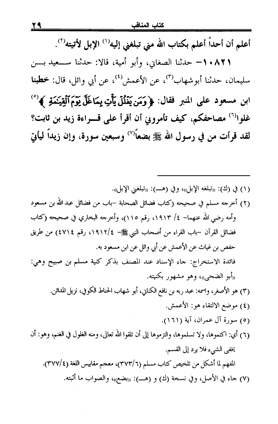 (¬9) أخرجه مسلم في صحيحه (كتاب فضائل الصحابة -باب من فضائل عبد الله بن مسعود وأمه رضي الله عنهما- 4/ 1912، رقم 114).