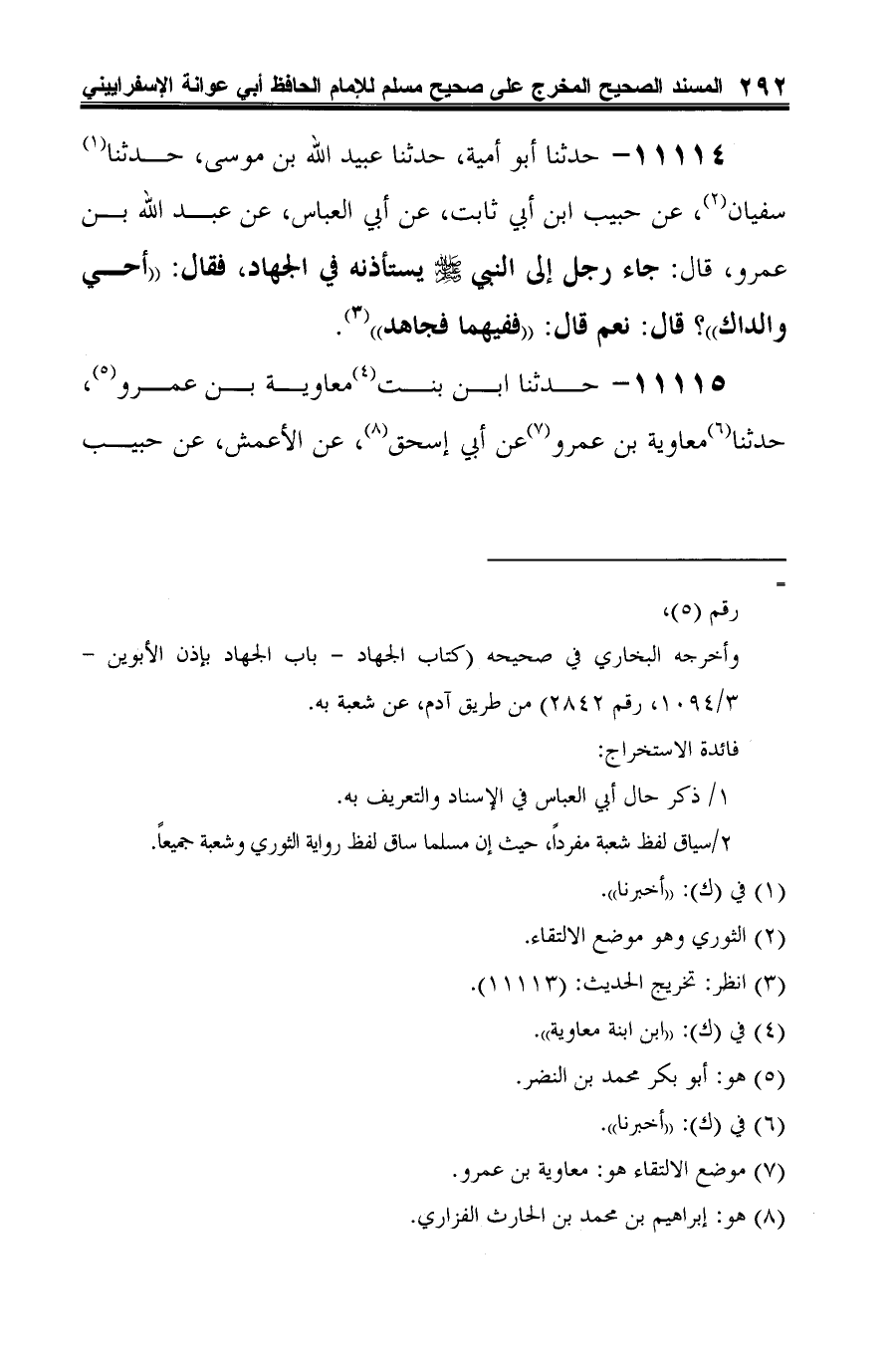 11114 - حدثنا أبو أمية، حدثنا عبيد الله بن موسى، حدثنا (¬1) سفيان (¬2)، عن حبيب ابن أبي ثابت، عن أبي العباس، عن عبد الله بن عمرو، قال: جاء رجل إلى النبي -صلى الله عليه وسلم- يستأذنه في الجهاد، فقال: "أحي والداك"؟ قال: نعم قال: "ففيهما فجاهد" (¬3).