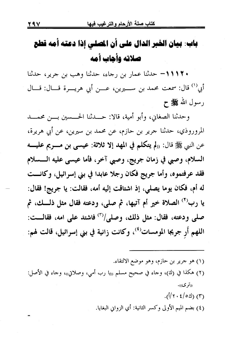 وحدثنا الصغاني، وأبو أمية، قالا: حدثنا الحسين بن محمد المروروذي، حدثنا جرير بن حازم، عن محمد بن سيرين، عن أبي هريرة، عن النبي صلى الله عليه وسلم قال: "لم يتكلم في المهد إلا ثلاثة: عيسى بن مريم عليه السلام، وصبي في زمان جريج، وصبي آخر، فأما عيسى عليه السلام فقد عرفتموه، وأما جريج فكان رجلا عابدا في بني إسرائيل، وكانت له أم، فكان يوما يصلي، إذ اشتاقت إليه أمه، فقالت: يا جريج! فقال: يا رب (¬2) الصلاة خير أم آتيها، ثم صلى، ودعته فقال مثل ذلك، ثم صلى ودعته، فقال: مثل ذلك، وصلى (¬3) فاشتد على أمه، فقالت: اللهم أَرِ جريجا المومسات (¬4)، وكانت زانية في بني إسرائيل، قالت لهم: