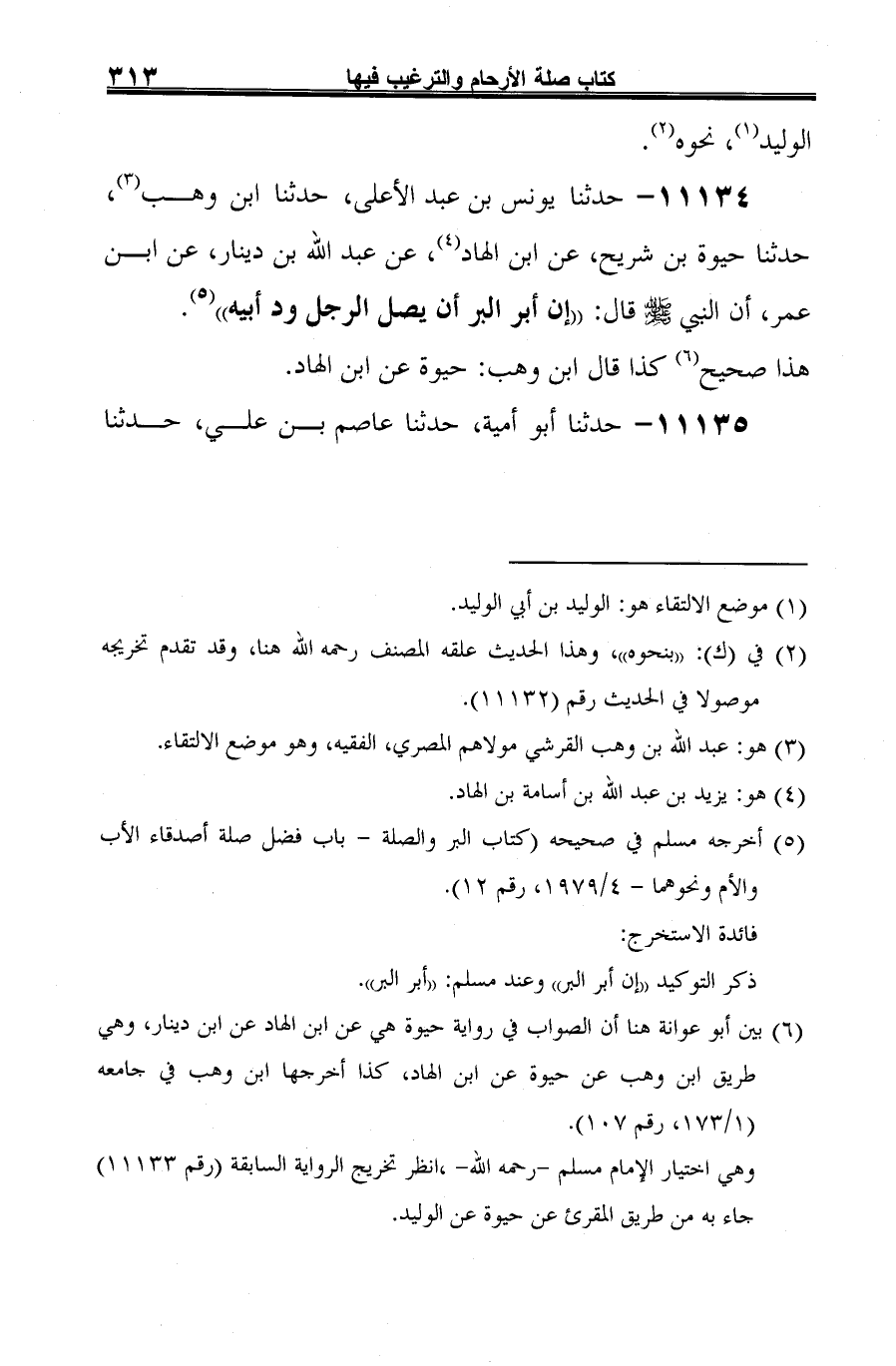 11134 - حدثنا يونس بن عبد الأعلى، حدثنا ابن وهب (¬1)، حدثنا حيوة بن شريح، عن ابن الهاد (¬2)، عن عبد الله بن دينار، عن ابن عمر، أن النبي صلى الله عليه وسلم قال: "إن أبر البر أن يصل الرجل ود أبيه" (¬3).