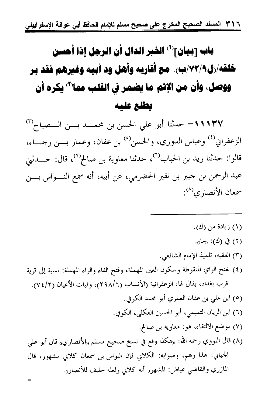 (¬8) أخرجه مسلم في صحيحه (كتاب البر والصلة -باب تفسير البر والإثم - 4/ 1980، رقم 14).