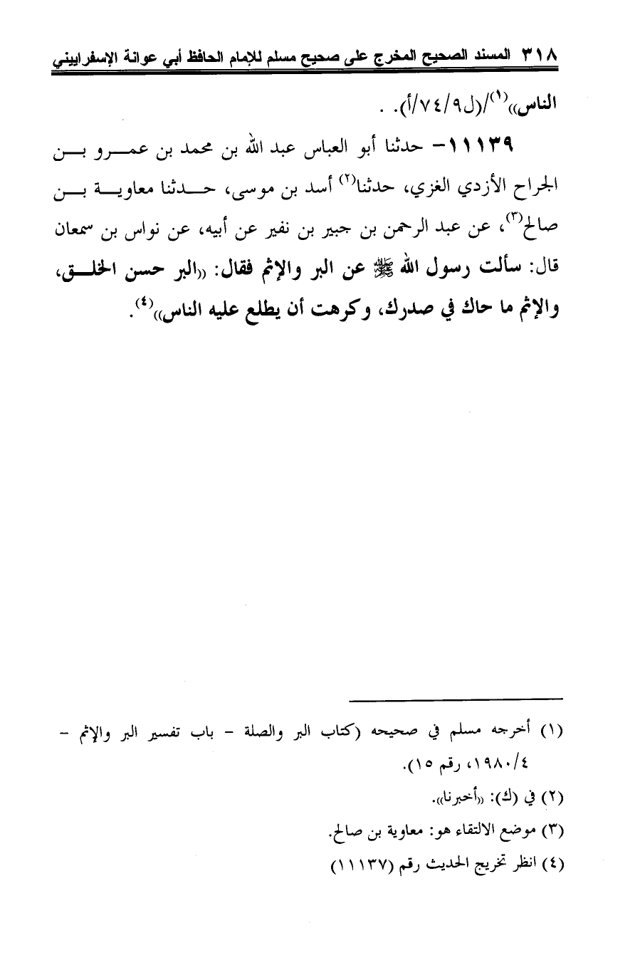 11139 - حدثنا أبو العباس عبد الله بن محمد بن عمرو بن الجراح الأزدي الغزي، حدثنا (¬1) أسد بن موسى، حدثنا معاوية بن صالح (¬2)، عن عبد الرحمن بن جبير بن نفير عن أبيه، عن نواس بن سمعان قال: سألت رسول الله صلى الله عليه وسلم عن البر والإثم فقال: "البر حسن الخلق، والإثم ما حاك في صدرك، وكرهت أن يطلع عليه الناس" (¬3).