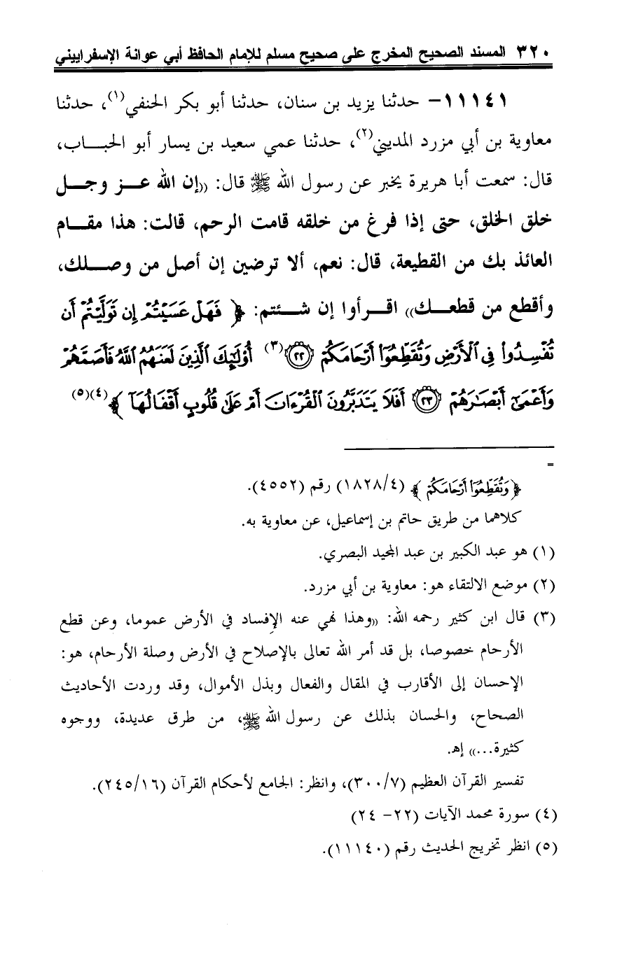 11141 - حدثنا يزيد بن سنان، حدثنا أبو بكر الحنفي (¬1)، حدثنا معاوية بن أبي مزرد المديني (¬2)، حدثنا عمي سعيد بن يسار أبو الحباب، قال: سمعت أبا هريرة يخبر عن رسول الله صلى الله عليه وسلم قال: "إن الله عز وجل خلق الخلق، حتى إذا فرغ من خلقه قامت الرحم، قالت: هذا مقام العائذ بك من القطيعة، قال: نعم، ألا ترضين أن أصل من وصلك، وأقطع من قطعك" اقرأوا إن شئتم: {فَهَلْ عَسَيْتُمْ إِنْ تَوَلَّيْتُمْ أَنْ تُفْسِدُوا في الْأَرْضِ وَتُقَطِّعُوا أَرْحَامَكُمْ (22) (¬3) أُولَئِكَ الَّذِينَ لَعَنَهُمُ اللَّهُ فَأَصَمَّهُمْ وَأَعْمَى أَبْصَارَهُمْ (23) أَفَلَا يَتَدَبَّرُونَ الْقُرْآنَ أَمْ عَلَى قُلُوبٍ أَقْفَالُهَا} (¬4) (¬5)