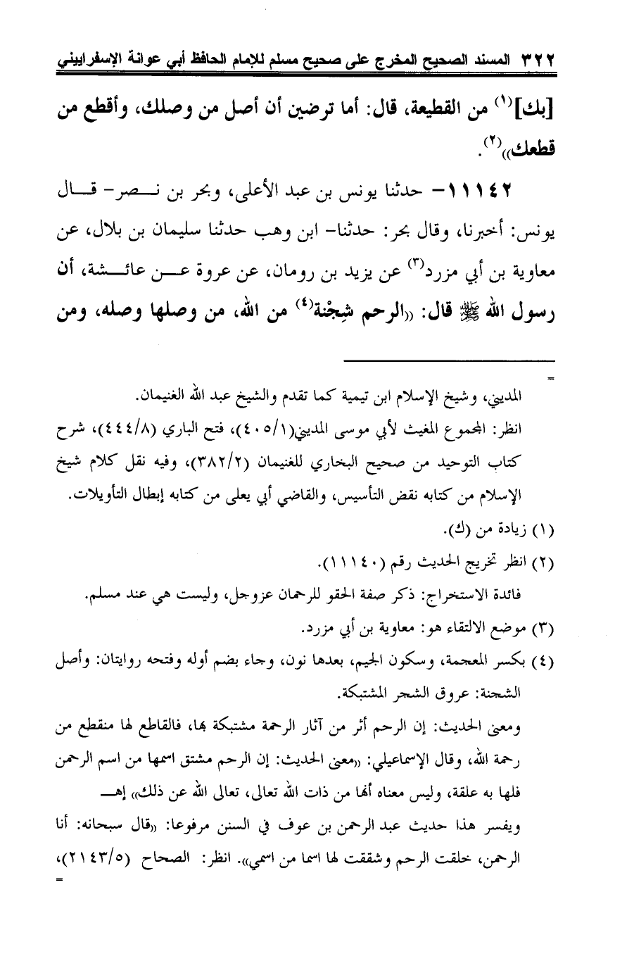 (¬3) أخرجه مسلم في صحيحه (كتاب البر والصلة والآداب -باب صلة الرحم وتحريم قطعتها -4/ 1981، رقم 17)، والبخاري في صحيحه (كتاب الأدب -باب من وصل وصله الله - 5/ 2232)، رقم 5643) من طريق سعيد بن أبي مريم عن سليمان بن بلال به.
