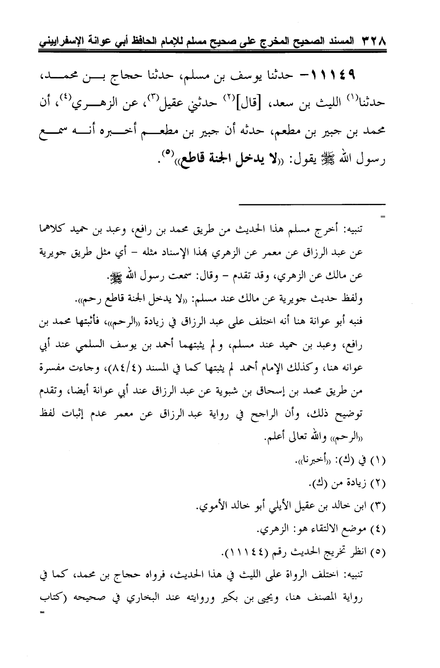 11149 - حدثنا يوسف بن مسلم، حدثنا حجاج بن محمَّد، حدثنا (¬1) الليث بن سعد، [قال] (¬2) حدثني عقيل (¬3)، عن الزهريّ (¬4)، أن محمَّد بن جبير بن مطعم، حدثه أن جبير بن مطعم أخبره أنه سمع رسول الله -صلى الله عليه وسلم- يقول: "لا يدخل الجنة قاطع" (¬5).