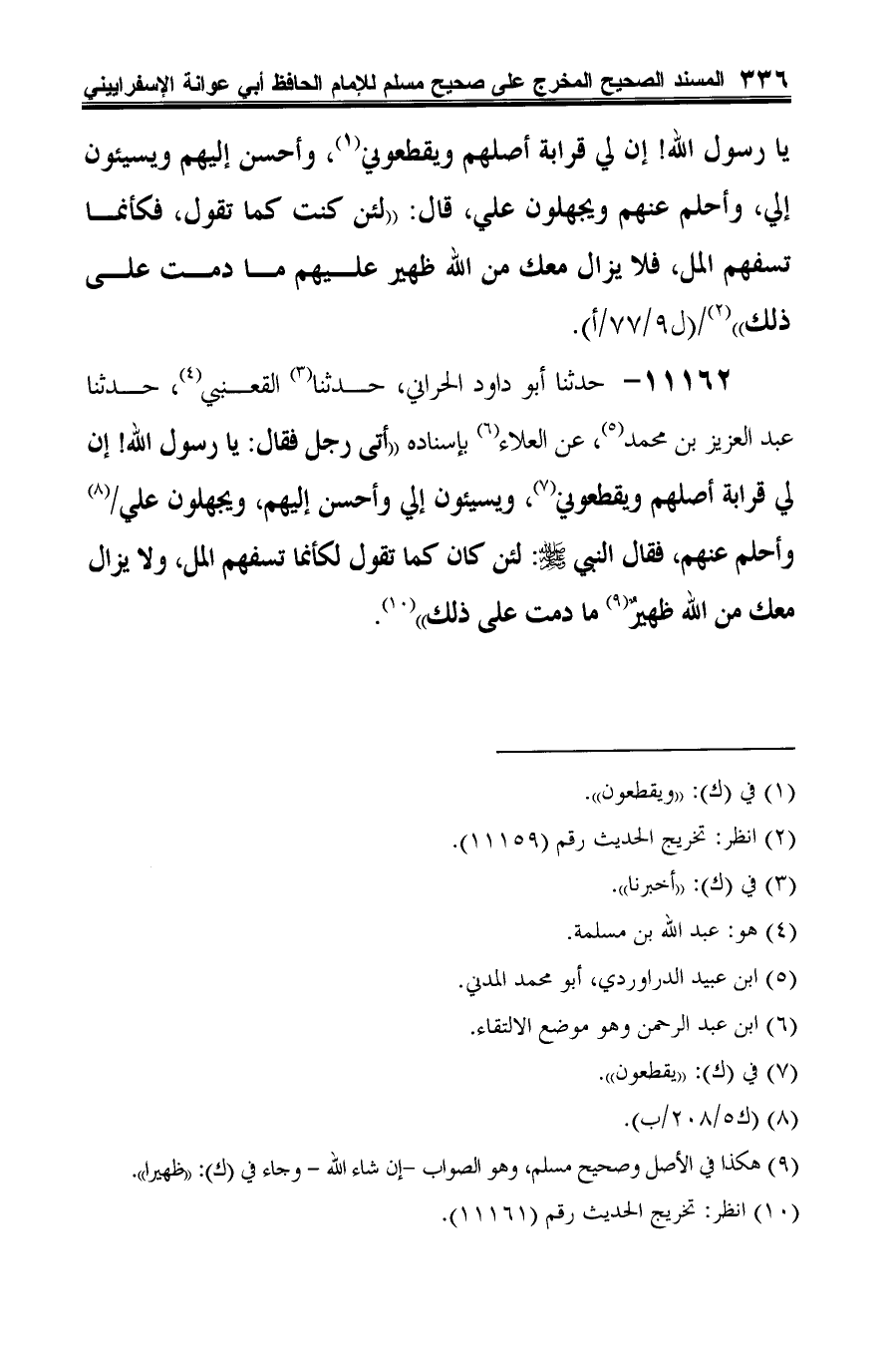 11162 - حدثنا أبو داود الحراني، حدثنا (¬1) القعنبي (¬2)، حدثنا عبد العزيز بن محمَّد (¬3)، عن العلاء (¬4) بإسناده "أتى رجل فقال: يا رسول الله! إن لي قرابة أصلهم ويقطعوني (¬5)، ويسيئون إلي وأحسن إليهم، ويجهلون علي (¬6) وأحلم عنهم، فقال النبي -صلى الله عليه وسلم-: لئن كان كما تقول لكأنما تسفهم المل، ولا يزال معك من الله ظهيرٌ (¬7) ما دمت على ذلك" (¬8).