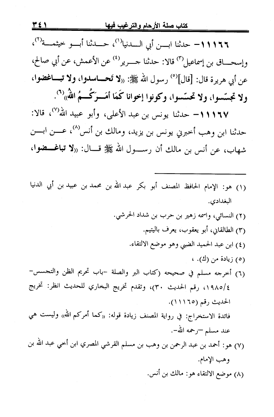 11166 - حدثنا ابن أبي الدنيا (¬1)، حدثنا أبو خيثمة (¬2)، وإسحاق بن إسماعيل (¬3) قالا: حدثنا جرير (¬4) عن الأعمش، عن أبي صالح، عن أبي هريرة قال: [قال] (¬5) رسول الله -صلى الله عليه وسلم-: "لا تَحاسدوا, ولا تباغضوا، ولا تجسّسوا, ولا تحسّسوا، وكونوا إخوانا كَمَا أمَرَكُمُ الله" (¬6).