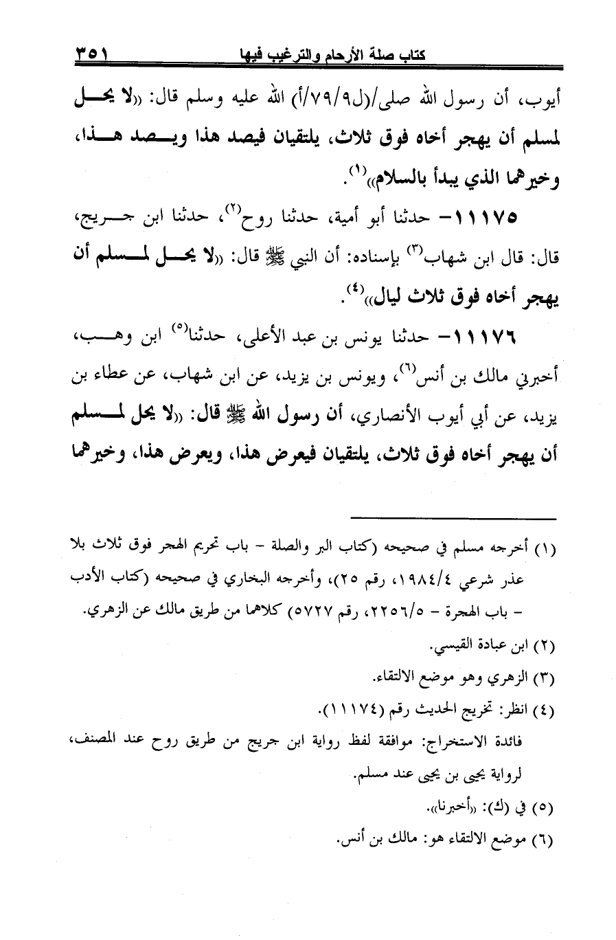 11175 - حدثنا أبو أمية، حدثنا روح (¬1)، حدثنا ابن جريج، قال: قال ابن شهاب (¬2) بإسناده: أن النبي -صلى الله عليه وسلم- قال: "لا يحل لمسلم أن يهجر أخاه فوق ثلاث ليال" (¬3).