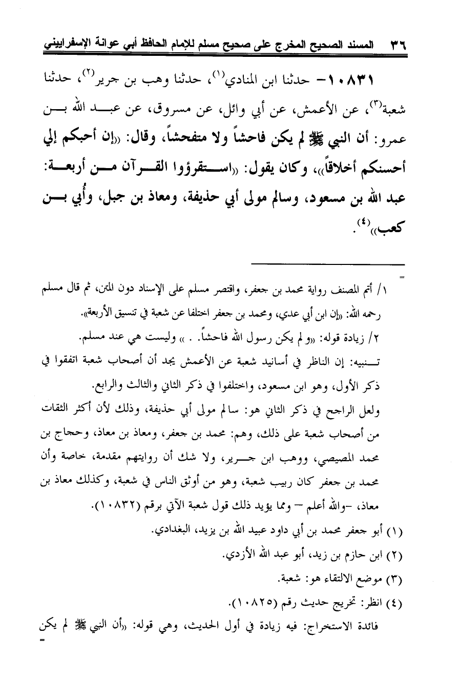 10831 - حدثنا ابن المنادي (¬1)، حدثنا وهب بن جرير (¬2)، حدثنا شعبة (¬3)، عن الأعمش، عن أبي وائل، عن مسروق، عن عبد الله بن عمرو: أن النبي -صلى الله عليه وسلم- لم يكن فاحشًا ولا متفحشًا، وقال: "إن أحبكم إلي أحسنكم أخلاقًا"، وكان يقول: "استقرؤوا القرآن من أربعة: عبد الله بن مسعود، وسالم مولى أبي حذيفة، ومعاذ بن جبل، وأُبي بن كعب" (¬4).