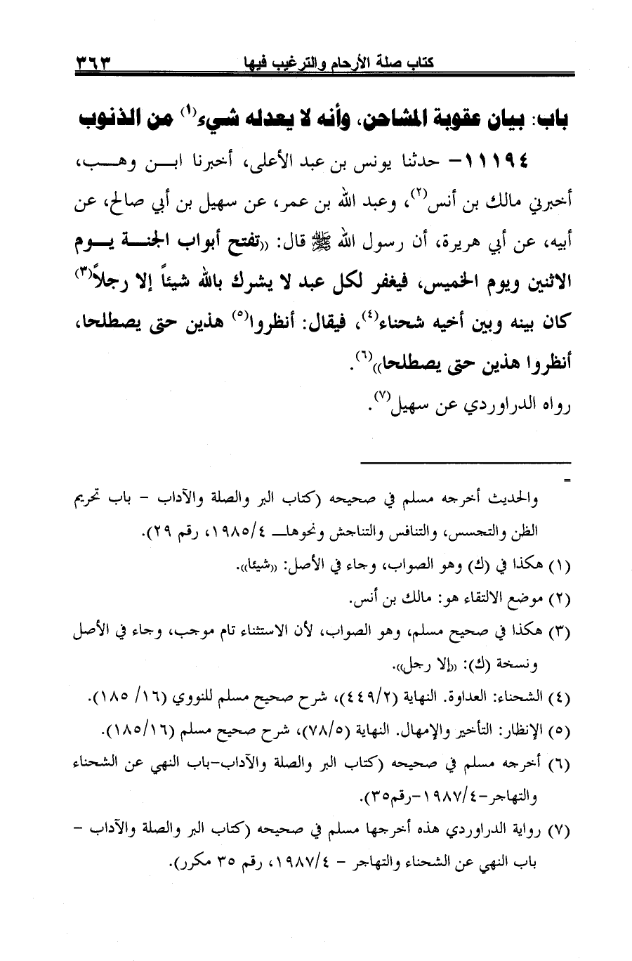 (¬3) الشحناء: العداوة. النهاية (2/ 449)، شرح صحيح مسلم للنووي (16/ 185).