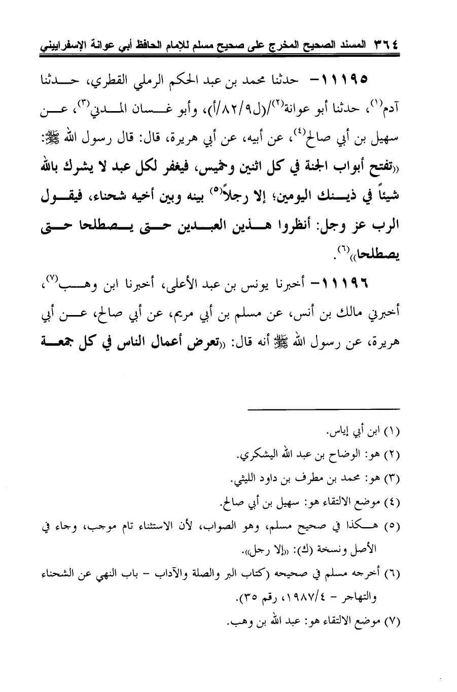 11195 - حدثنا محمَّد بن عبد الحكم الرملي القطري، حدثنا آدم (¬1)، حدثنا أبو عوانة (¬2)، وأبو غسان المدني (¬3)، عن سهيل بن أبي صالح (¬4)، عن أبيه، عن أبي هريرة، قال: قال رسول الله -صلى الله عليه وسلم-: "تفتح أبواب الجنة في كل اثنين وخميس، فيغفر لكل عبد لا يشرك بالله شيئًا في ذينك اليومين، إلا رجلًا (¬5) بينه وبين أخيه شحناء، فيقول الرب عَزَّ وَجَلَّ: أنظروا هذين العبدين حتى يصطلحا حتى يصطلحا" (¬6).