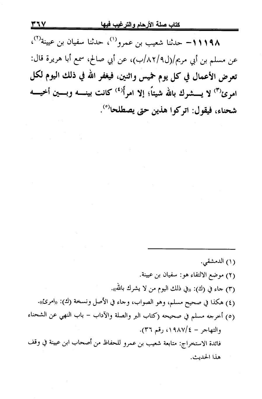 11198 - حدثنا شعيب بن عمرو (¬1)، حدثنا سفيان بن عيينة (¬2)، عن مسلم بن أبي مريم، عن أبي صالح، سمع أبا هريرة قال: تعرض الأعمال في كل يوم خميس واثنين، فيغفر الله في ذلك اليوم لكل امرئ (¬3) لا يشرك بالله شيئًا؛ إلا امرأً (¬4) كانت بينه وبين أخيه شحناء، فيقول: اتركوا هذين حتى يصطلحا (¬5).