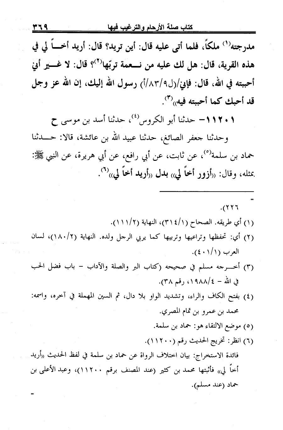 -[370]- = وفي هذه الرواية عند المصنف (برقم 11201) قال أسد بن موسى وعبيد الله بن عائشة: "أزور أخًا لي"، وفي الرواية الأخرى من طريق يزيد بن هارون (عند المصنف برقم 11202) بلفظ: "أريد فلانًا"، ولم يقل: "أريد أخًا لي".