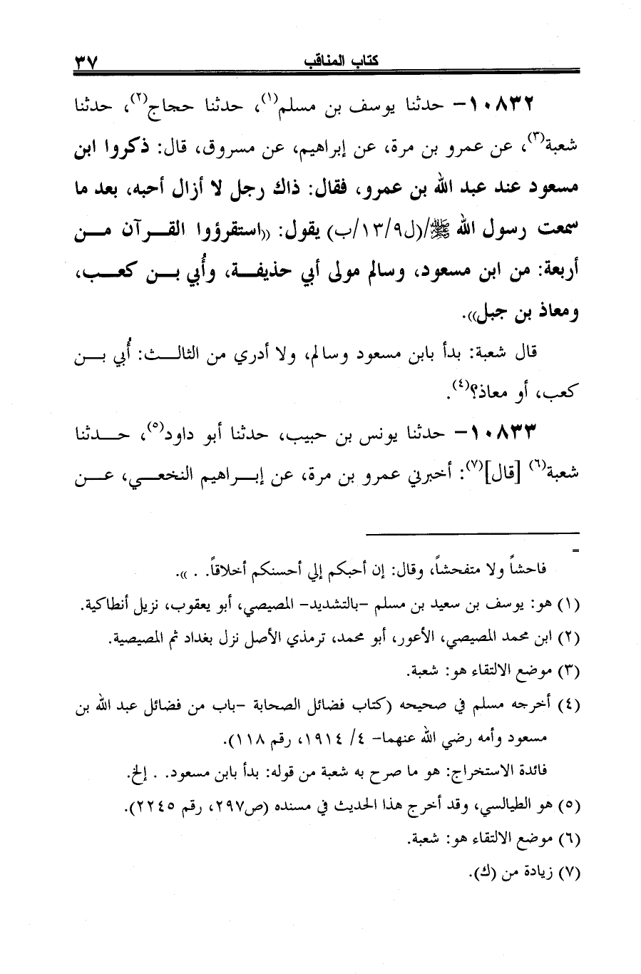 10832 - حدثنا يوسف بن مسلم (¬1)، حدثنا حجاج (¬2)، حدثنا شعبة (¬3)، عن عمرو بن مرة، عن إبراهيم، عن مسروق، قال: ذكروا ابن مسعود عند عبد الله بن عمرو، فقال: ذاك رجل لا أزال أحبه، بعد ما سمعت رسول الله -صلى الله عليه وسلم- يقول: "استقرؤوا القرآن من أربعة: من ابن مسعود، وسالم مولى أبي حذيفة، وأُبي بن كعب، ومعاذ بن جبل".