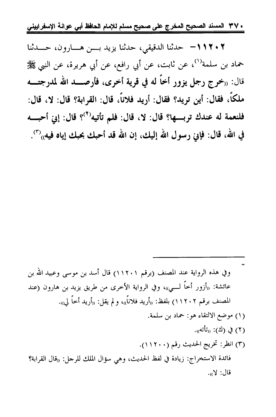 11202 - حدثنا الدقيقي، حدثنا يزيد بن هارون، حدثنا حماد بن سلمة (¬1)، عن ثابت، عن أبي رافع، عن أبي هريرة، عن النبي -صلى الله عليه وسلم- قال: "خرج رجل يزور أخًا له في قرية أخرى، فأرصد الله لمدرجته ملكًا، فقال: أين تريد؟ فقال: أريد فلانًا، قال: القرابة؟ قال: لا، قال: فلنعمة له عندك تربها؟ قال: لا، قال: فلم تأتيه (¬2)؟ قال: إني أحبه في الله، قال: فإني رسول الله إليك، إن الله قد أحبك بحبك إياه فيه" (¬3).