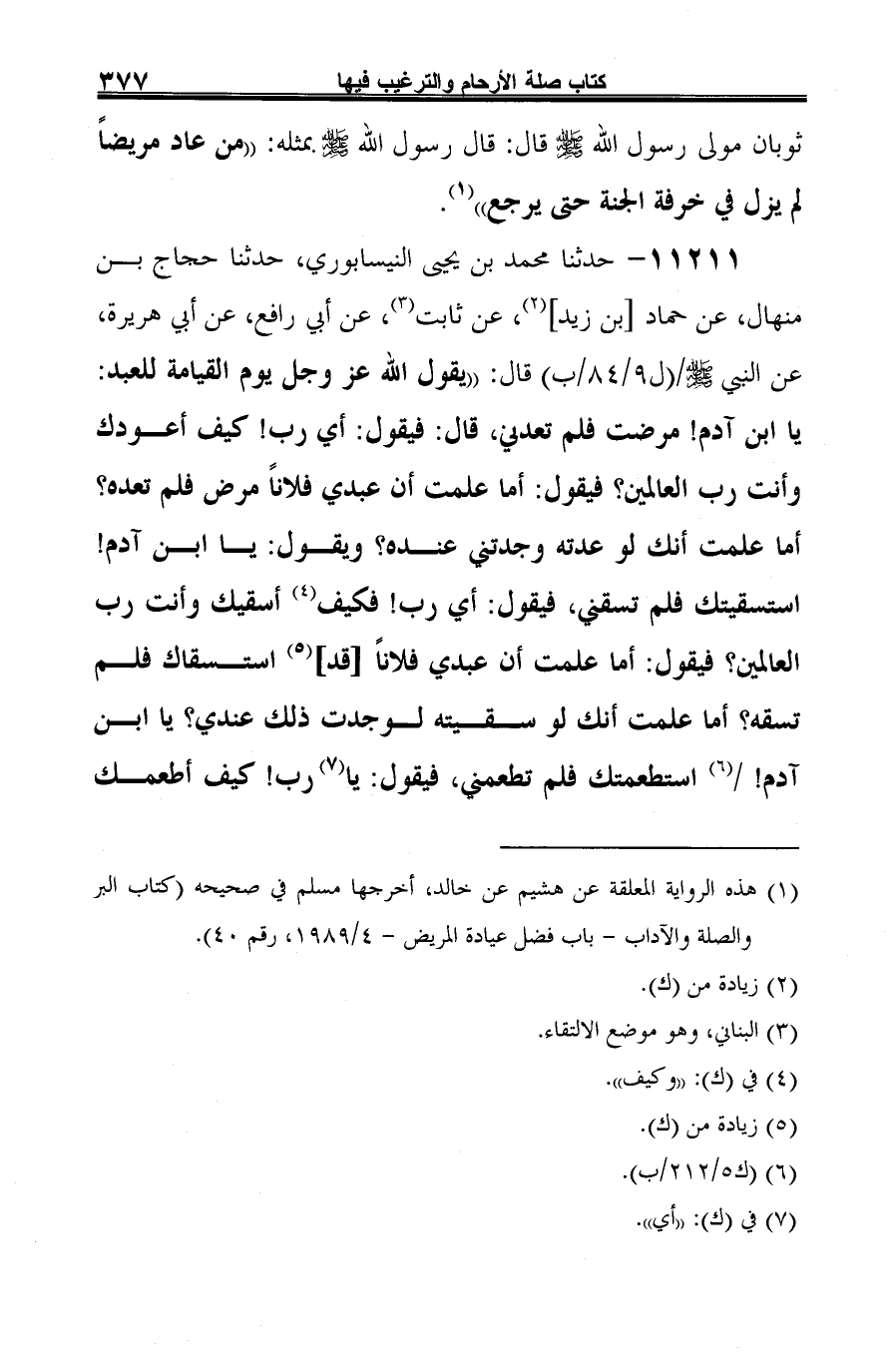 11211 - حدثنا محمَّد بن يحيى النيسابوري، حدثنا حجاج بن منهال، عن حماد ابن زيدًا (¬1)، عن ثابت (¬2)، عن أبي رافع، عن أبي هريرة، عن النبي -صلى الله عليه وسلم- قال: "يقول الله عَزَّ وَجَلَّ يوم القيامة للعبد: يا ابن آدم! مرضت فلم تعدني، قال: فيقول: أي رب! كيف أعودك وأنت رب العالمين؟ فيقول: أما علمت أن عبدي فلانًا مرض فلم تعده؟ أما علمت أنك لو عدته وجدتني عنده؟ ويقول: يا ابن آدم! استسقيتك فلم تسقني، فيقول: أي رب! فكيف (¬3) أسقيك وأنت رب العالمين؟ فيقول: أما علمت أن عبدي فلانًا [قد] (¬4) استسقاك فلم تسقه؟ أما علمت أنك لو سقيته لوجدت ذلك عندي؟ يا ابن آدم! (¬5) استطعمتك فلم تطعمني، فيقول: يا (¬6) رب! كيف أطعمك