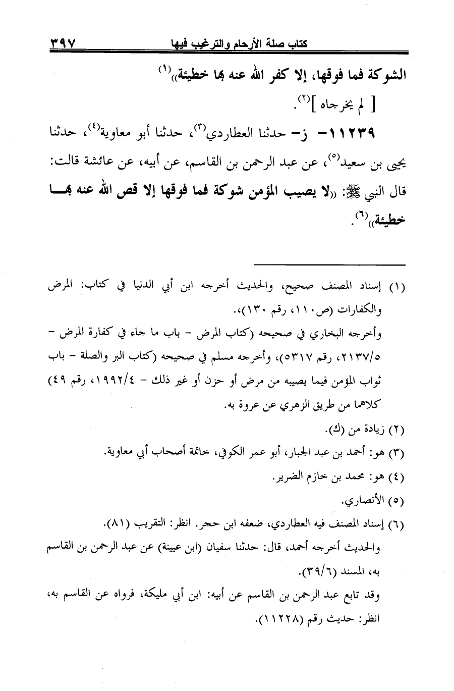 11239 - ز- حدثنا العطاردي (¬1)، حدثنا أبو معاوية (¬2)، حدثنا يحيى بن سعيد (¬3)، عن عبد الرحمن بن القاسم، عن أبيه، عن عائشة قالت: قال النبي -صلى الله عليه وسلم-: "لا يصيب المؤمن شوكة فما فوقها إلا قص الله عنه بها خطيئة" (¬4).