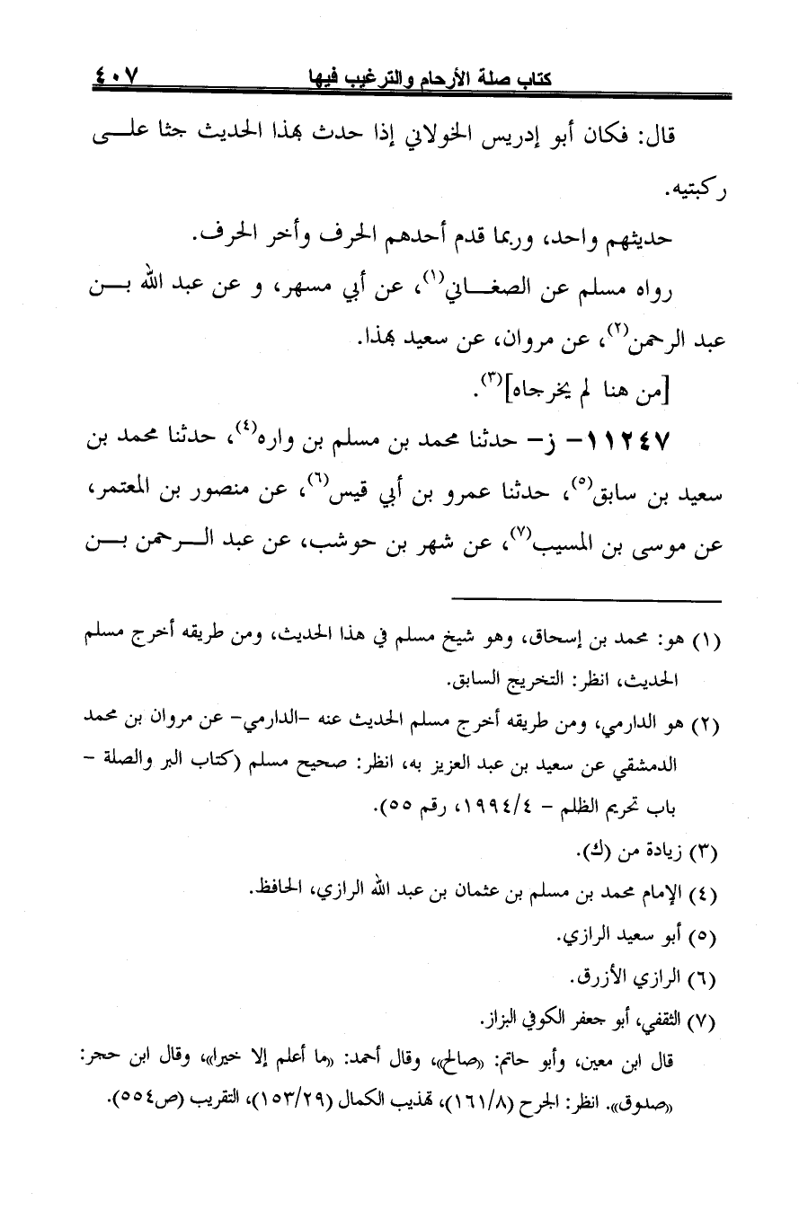 11247 - ز- حدثنا محمد بن مسلم بن واره (¬1)، حدثنا محمد بن سعيد بن سابق (¬2)، حدثنا عمرو بن أبي قيس (¬3)، عن منصور بن المعتمر، عن موسى بن المسيب (¬4)، عن شهر بن حوشب، عن عبد الرحمن بن