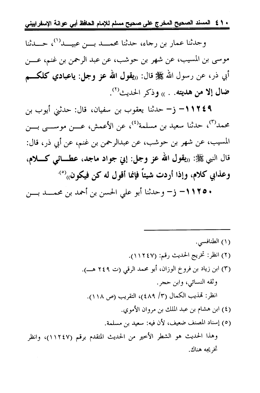 11249 - ز- حدثنا يعقوب بن سفيان، قال: حدثني أيوب بن محمد (¬1)، حدثنا سعيد بن مسلمة (¬2)، عن الأعمش، عن موسى بن المسيب، عن شهر بن حوشب، عن عبد الرحمن بن غنم، عن أبي ذر، قال: قال النبي -صلى الله عليه وسلم-: "يقول الله عز وجل: إني جواد ماجد، عطائي كلام، وعذابي كلام، وإذا أردت شيئًا فإنما أقول له كن فيكون" (¬3).