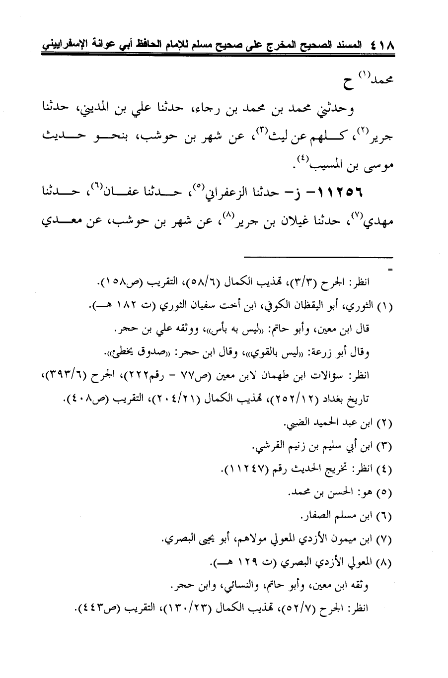 وهشام بن عروة بن الزبير أخرجه أبو عوانة (انظر: حديث رقم 11258) كلاهما عن شهر بن حوشب عن معدي كرب عن أبي ذر.